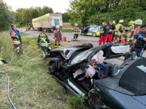 Zu einem schweren Verkehrsunfall in der Buchloer Straße mussten gestern die Feuerwehren aus Landsberg und Kaufering sowie Polizei und Rettungsdienst ausrücken – ein Cabrio war kurz zuvor in einen LKW geprallt. Dabei wurden die Cabrioinsassen im Fahrzeug eingeklemmt.